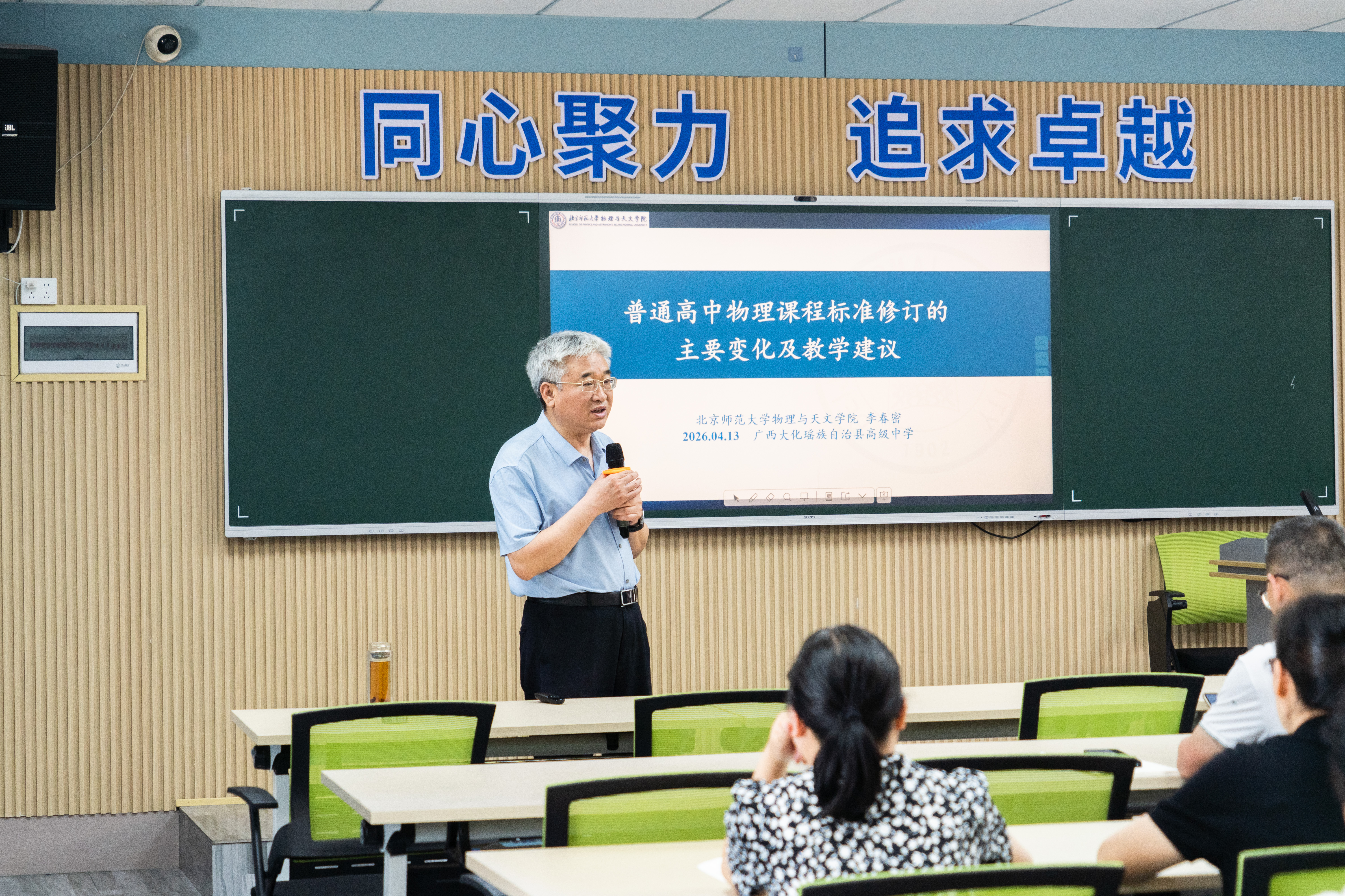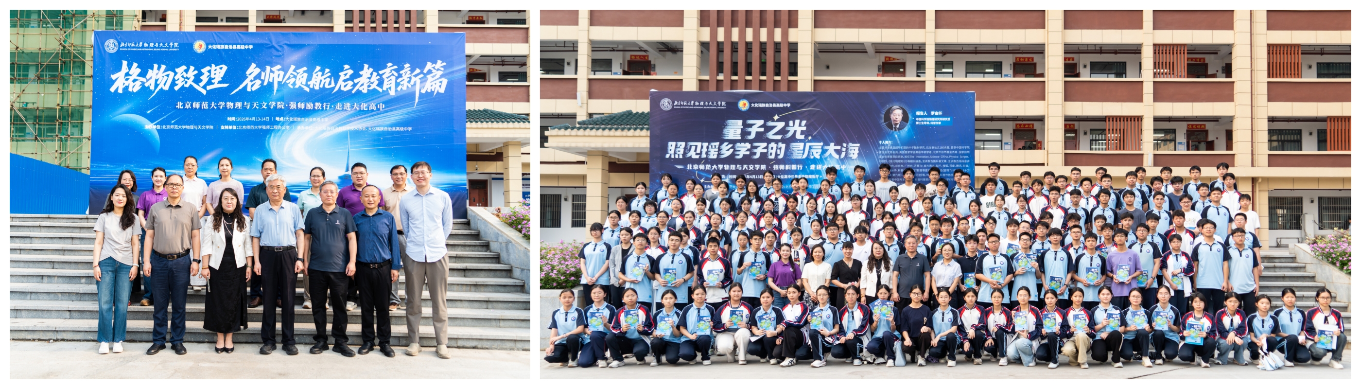 为深入贯彻新时代基础教育强师计划,落实“强师工程”服务县域教育发展的总体部署,4月13日至14日,北京师范大学物理与天文学院专家团队承载着百年京师物理的深厚根脉与“强师工程”的核心使命,走进广西大化瑶族自治县高级中学,开展为期两天的“强师励教行”与“强师科普行”系列专题活动。活动由北京师范大学物理与天文学院主办、北京师范大学强师工程办公室支持、大化瑶族自治县科学技术协会与大化瑶族自治县高级中学承办。由北京师范大学物理与天文学院组建的强师励教与强师科普专家团队,以专题座谈会、课堂诊断指导、教师专题讲座、学生科普讲座、物理科普书单及实验室建设指导等多元形式,将高校优质教育资源精准送达县域中学,服务乡村教育振兴,探索物理学科“大中衔接、协同育人”的创新路径。