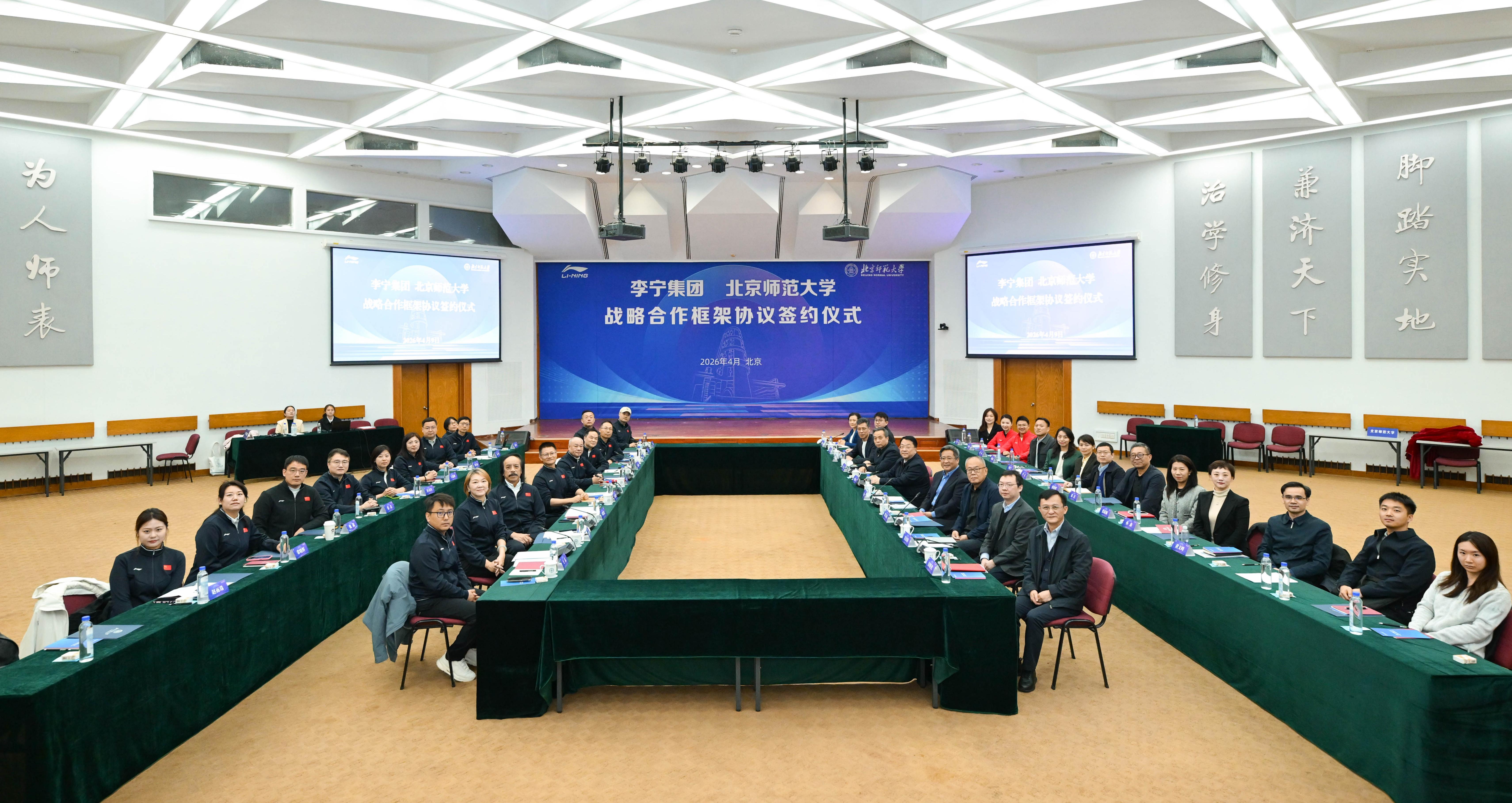 北京师范大学与李宁集团签署战略合作框架协议2026-04-134月9日上午,北京师范大学与李宁集团战略合作框架协议签约仪式在学校英东学术会堂举行。北京师范大学党委书记程建平、常务副校长王守军、副校长康震,李宁集团创始人、董事长李宁,副总裁金翟宣、宋春涛出席签约仪式。李宁集团有关部门负责人,北师大相关院系和部门负责人,以及体育与运动学院教师代表参加签约仪式。签约仪式由王守军主持。 -